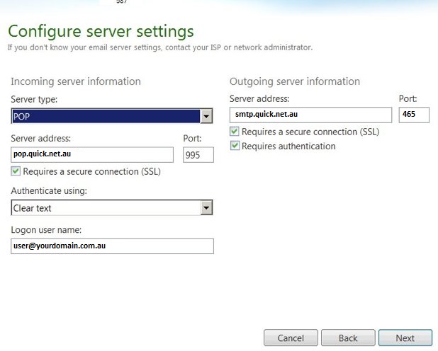 - Enter smtp.quick.net.au in the Outgoing server field.