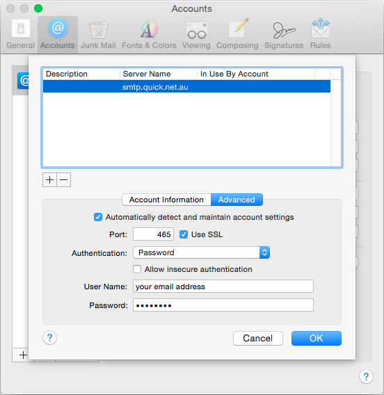 - Incoming Mail Server: imap.quick.net.au or pop.quick.net.au