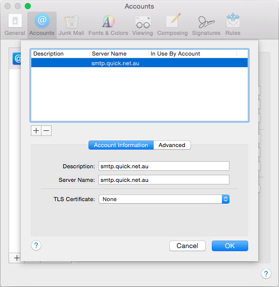 7. Select Edit Server List. Select the outgoing mail server. Check the server name is smtp.quick.net.au