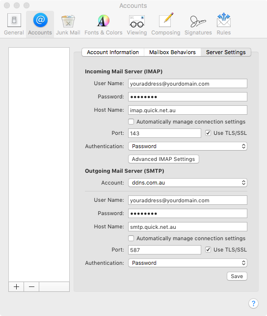 - Incoming Mail Server - Host Name: imap.quick.net.au or pop.quick.net.au